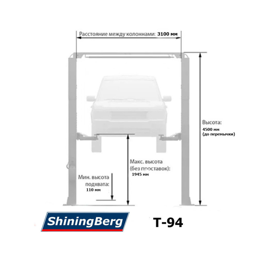 2-стоечный электрогидравлический подъемник с верхней синхронизацией Shiningberg T60 обеспечивает равномерный подъем автомобилей на высоту 1.9 м для удобства доступа к рабочим узлам. Модель успешно используется на станциях технического обслуживания, а также в отделах ПТО крупных автопарков.