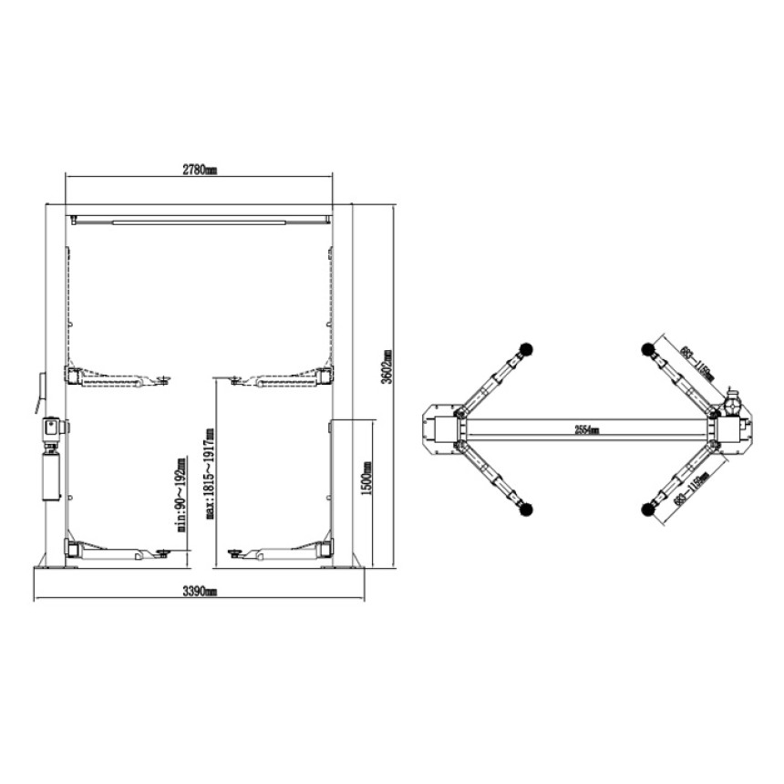 4 лапы - трех секционные, длина 683 -1159 мм Грузоподъемность 4.0T Время подъема 45 секунд Высота подъема 1815-1917 мм Общая высота 3602 мм Общая ширина 3390 мм Ширина сквозного проезда 2554 мм Ширина между колоннами 2780 мм Минимальная высота подушки 90 мм Двигатель 2.2 Кв