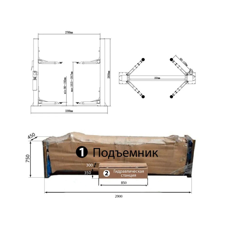 4 лапы - трех секционные, длина 683 -1159 мм Грузоподъемность 4 T Время подъема 45 секунд Высота подъема 1815-1917 мм Общая высота 2850 мм Общая ширина 3390 мм Ширина сквозного проезда 2554 мм Ширина между колоннами 2780 мм Минимальная высота подушки 90 мм Двигатель 2.2 Кв