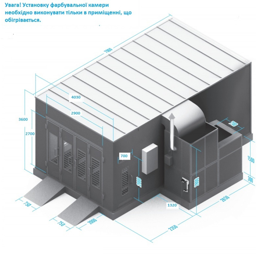 Наружные размеры камеры Д×Ш×В : 7,0×5,3×3,5 м. Конструктивные особенности: Кабина cостоит из сэндвич-панелей, внутри которых находится материал пенополистирол, толщиной 50 мм. Главная дверь: трехстворчатая, размером Ш×В 3,0×2,7 м. Аварийная дверь: Ш×В 0,8×2,0 м. Составной материал: сэндвич-алюминий. Основание: ровный бетонный пол; Основание камеры: полностью решетчатое высота пола 30 см; Основание группы притока высотой 30 см; Максимальная нагрузка: 600 кг на колесо. Освещение: Верхний уровень: 40 ламп по 40 Вт; Нижний...