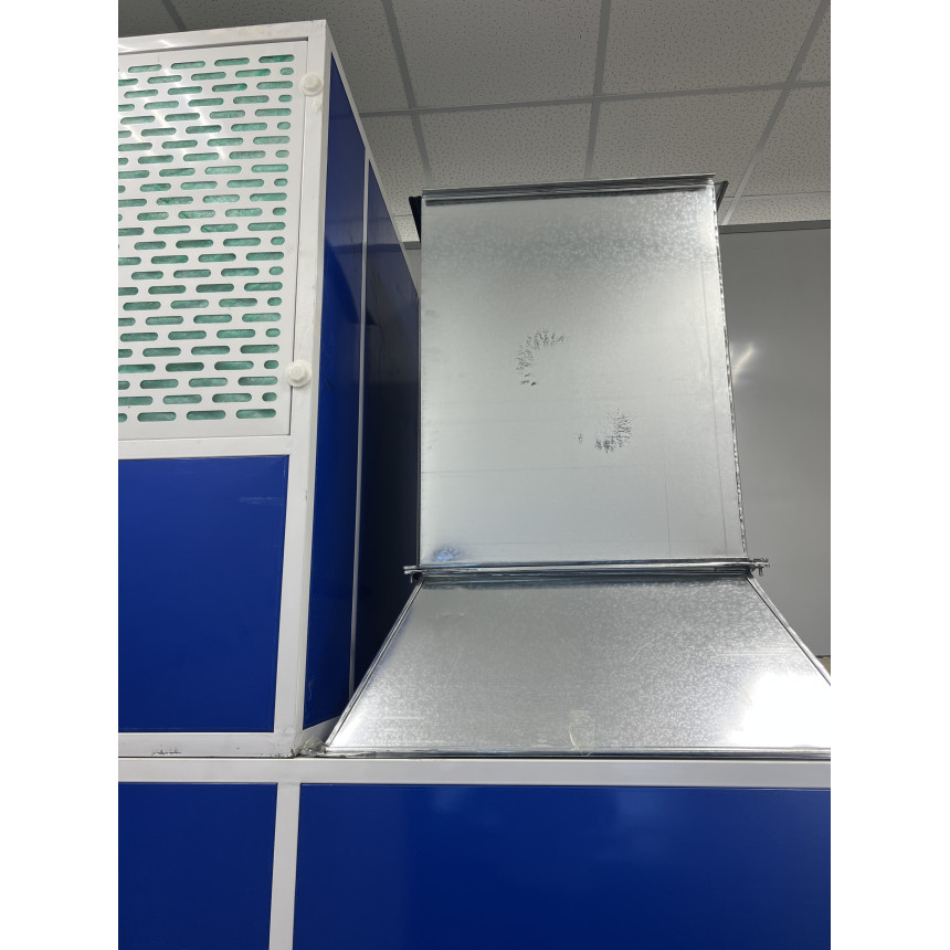 Кабина состоит из сэндвич-панелей изготовленных с дополнительным запасом прочности из толстого металла и наполненных пенополистиролом. Боковые светильники вмонтированы в панели, угловые светильники расположены вдоль по всей длине камеры. Все светильники - LED с пониженным энергопотреблением и имеют взрывозащищенное исполнение. Сэндвич-панели по торцам усилены дополнительными ребрами жесткости, что значительно продлевает срок их эксплуатации и исключает ситуации когда от избыточного давления панель может быть выдавлена воздухом. Также защитой от избыточного давления является боковая дверь оператора.