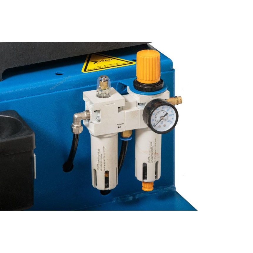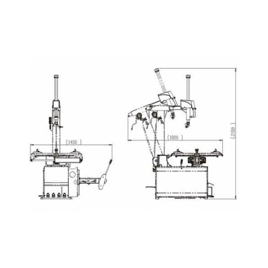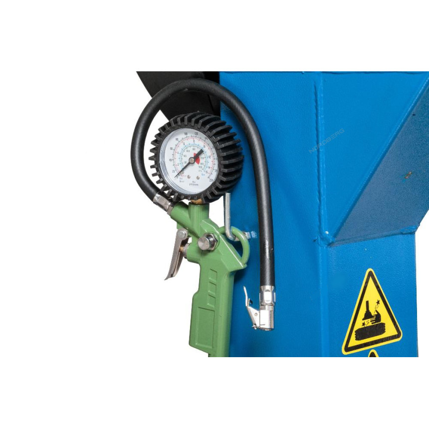 -шиномонтажный стенд с отклоняемой в бок консолью монтажной стойки с пластиковыми накладками -монтажная лопатка -устройство для отрыва борта шины -полка для размещения аксессуаров в основании монтажной стойки -влагомасло отделитель фильтр-лубрикатор -емкость для смазки