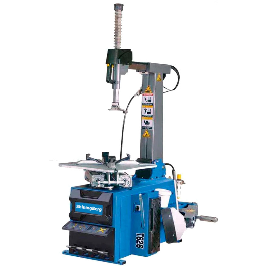 Шиномонтажный станок ShiningBerg T626 автоматический предназначен для работ с большими нестандартными колесами, металлическими и легкосплавными колесными дисками диаметром до 26 дюймов. Наружная фиксация до 24 дюйма позволяет без видимых повреждений разбирать и собирать колеса на дорогих титановых дисках. Усиленная конструкция станка с большим монтажным столом гарантирует высокую прочность при борте низкопрофильных шин. Процессы наклона и блокировки колонны производятся пневматическим управлением с помощью педали. Поворотный механизм стола с прочными и долговечными самоцентрирующимися зажимами. Передняя крышка блока педалей съемна на случай, когда возникает вопрос обслуживания. Педаль имеет функцию ступенчатого торможения, благодаря которому можно быстро и точно выставлять покрышку. Головка демонтажа изготовлена из специальной стали, износостойкой к деформации. Горизонтальное и вертикальное позиционирование демонтажной головы по отношению к диску. Головка демонтажа, настольные зажимные кулачки и отжимная лапа дополнительно оснащены защитными насадками, чтобы предотвратить повреждение дисков.