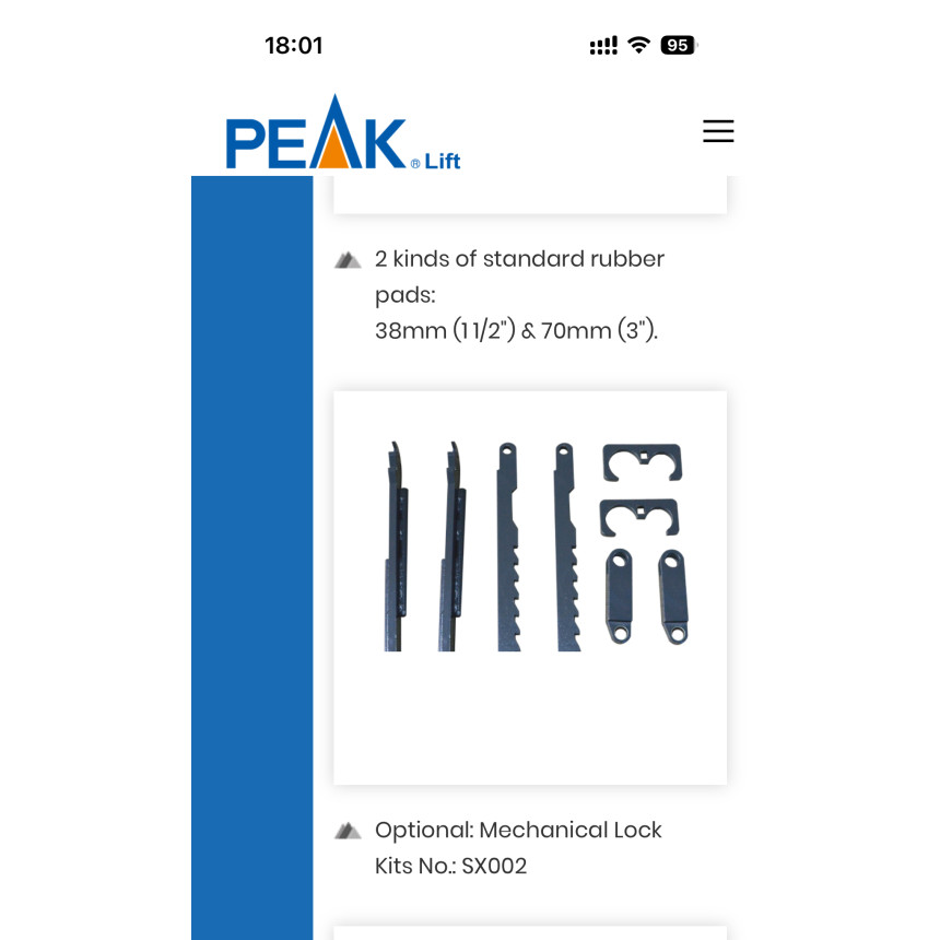 Грузоподъемность 3.0T Время подъема 40 секунд Высота подъема 2000 мм Минимальная высота 115 мм Длина посадочной полосы 1608 мм Ширина между посадочными полосами 750 мм Ширина посадочной полосы 600 мм Общая длина 2028 мм Мотор 2 кв